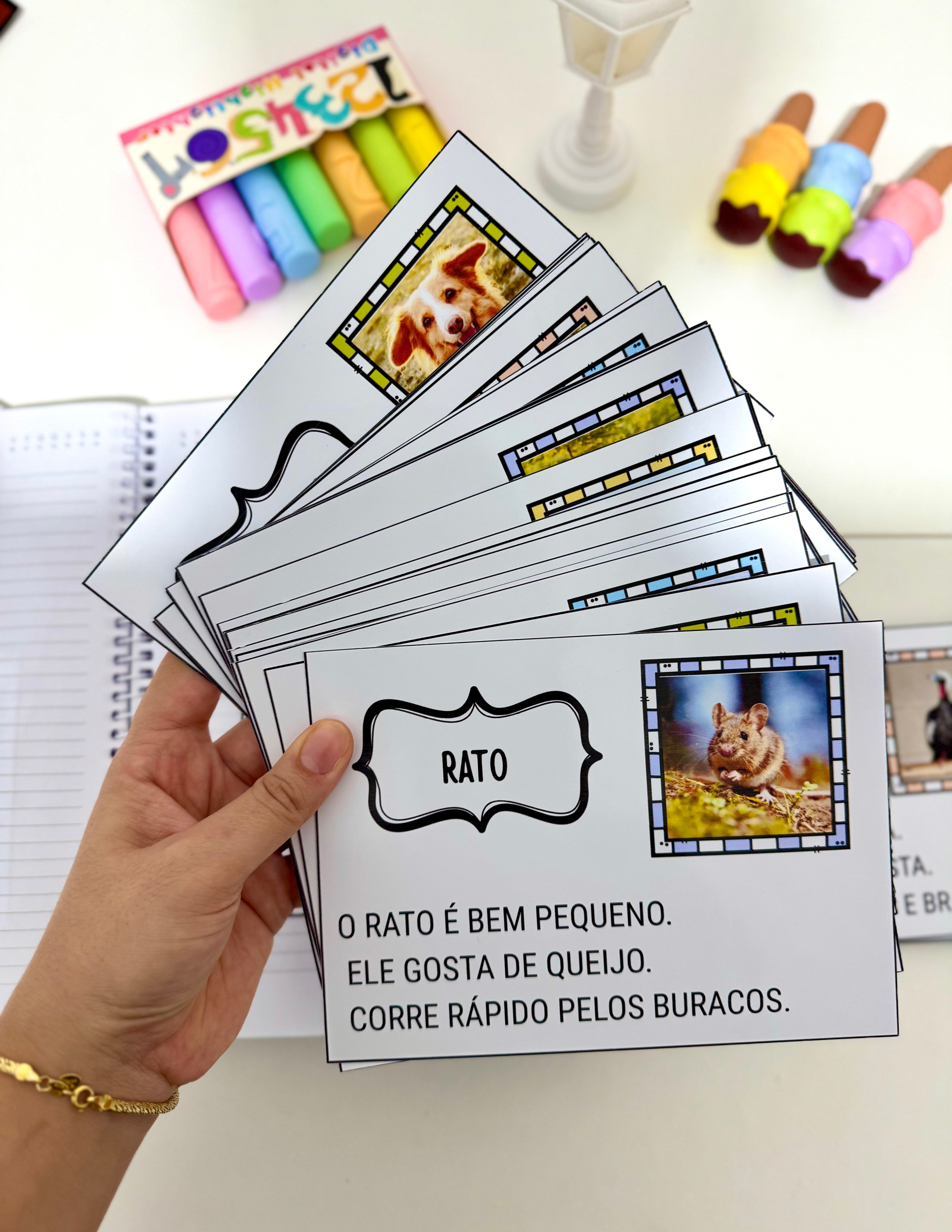 Cada ficha traz um texto simples sobre um animal, junto com foto real para