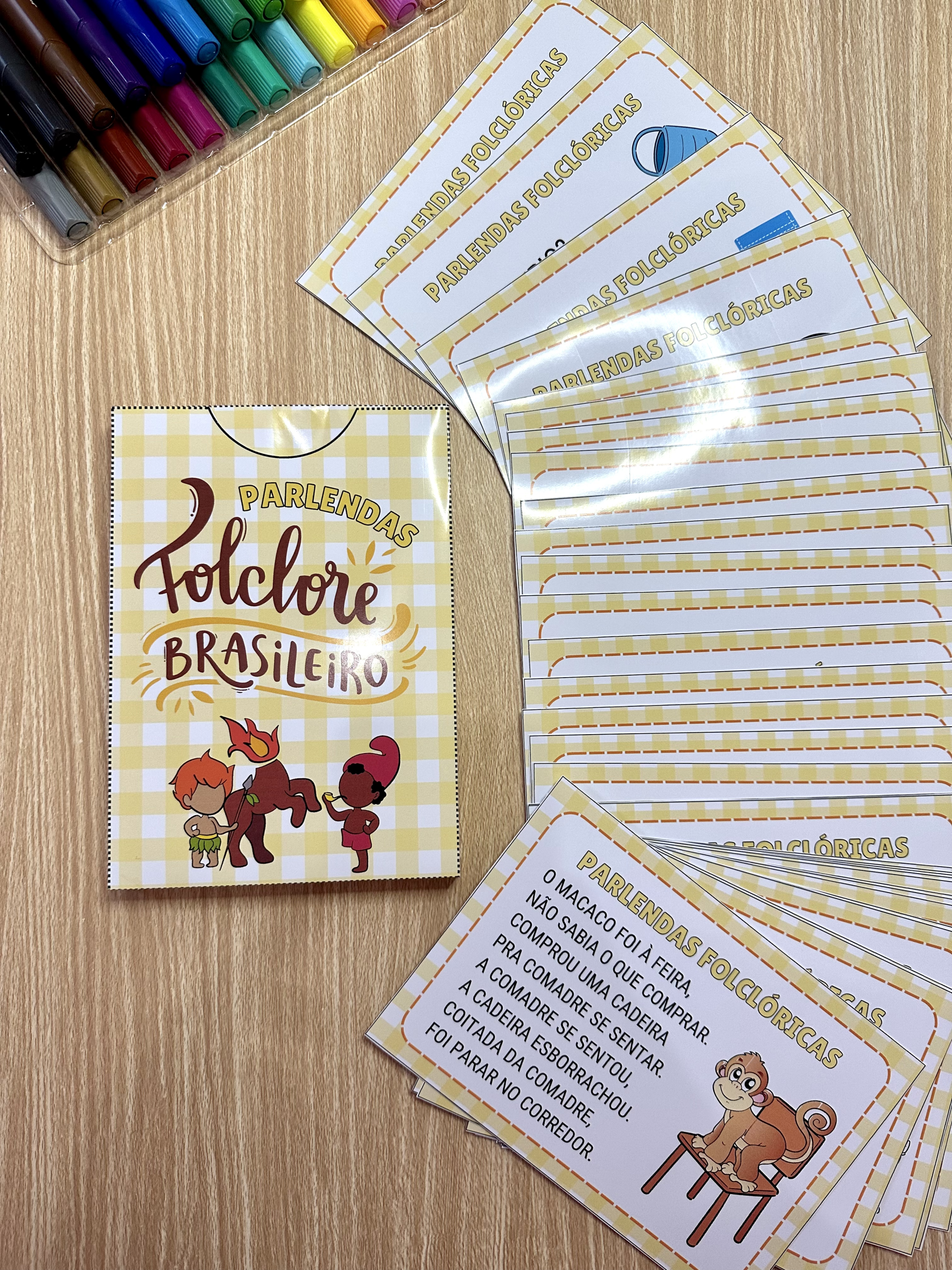 O arquivo Parlendas Folclóricas inclui 34 parlendas folclóricas e uma caixinha para guardar o material.