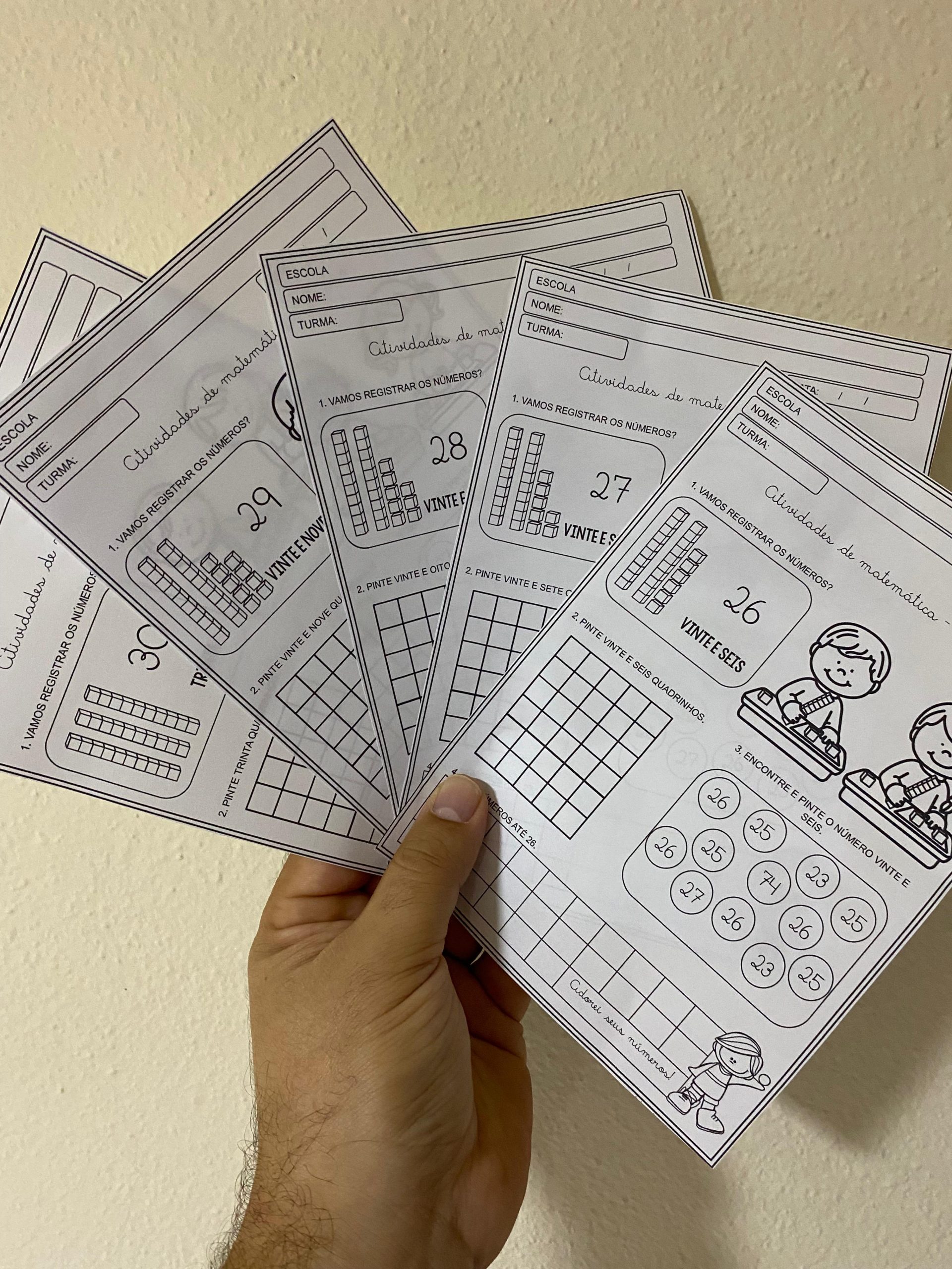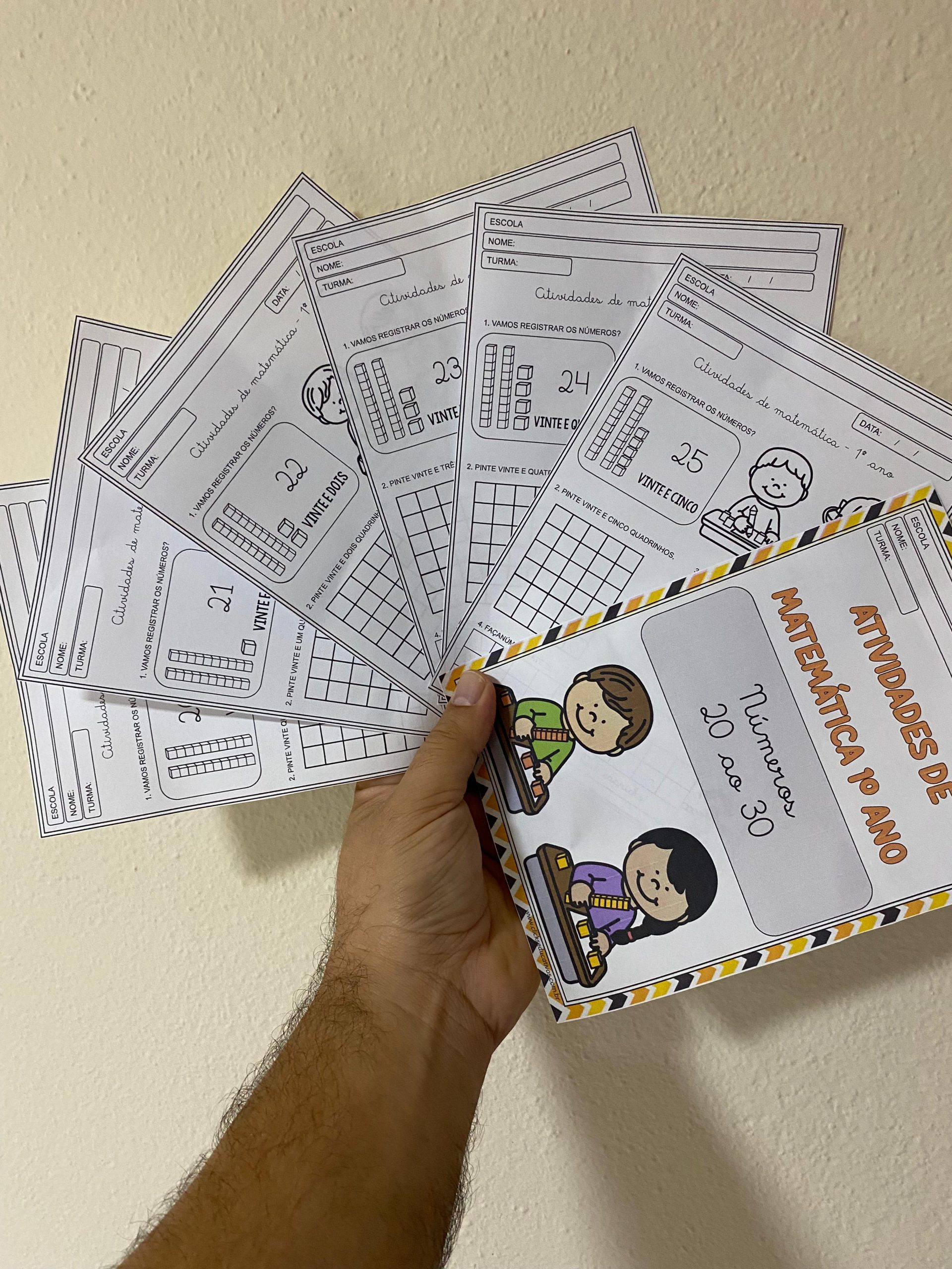 Aqui, trabalharemos números de 20 ao 30, totalizando 11 folhas de atividades. Abordamos  a representação numérica, registro, material dourado e escrita do número.
