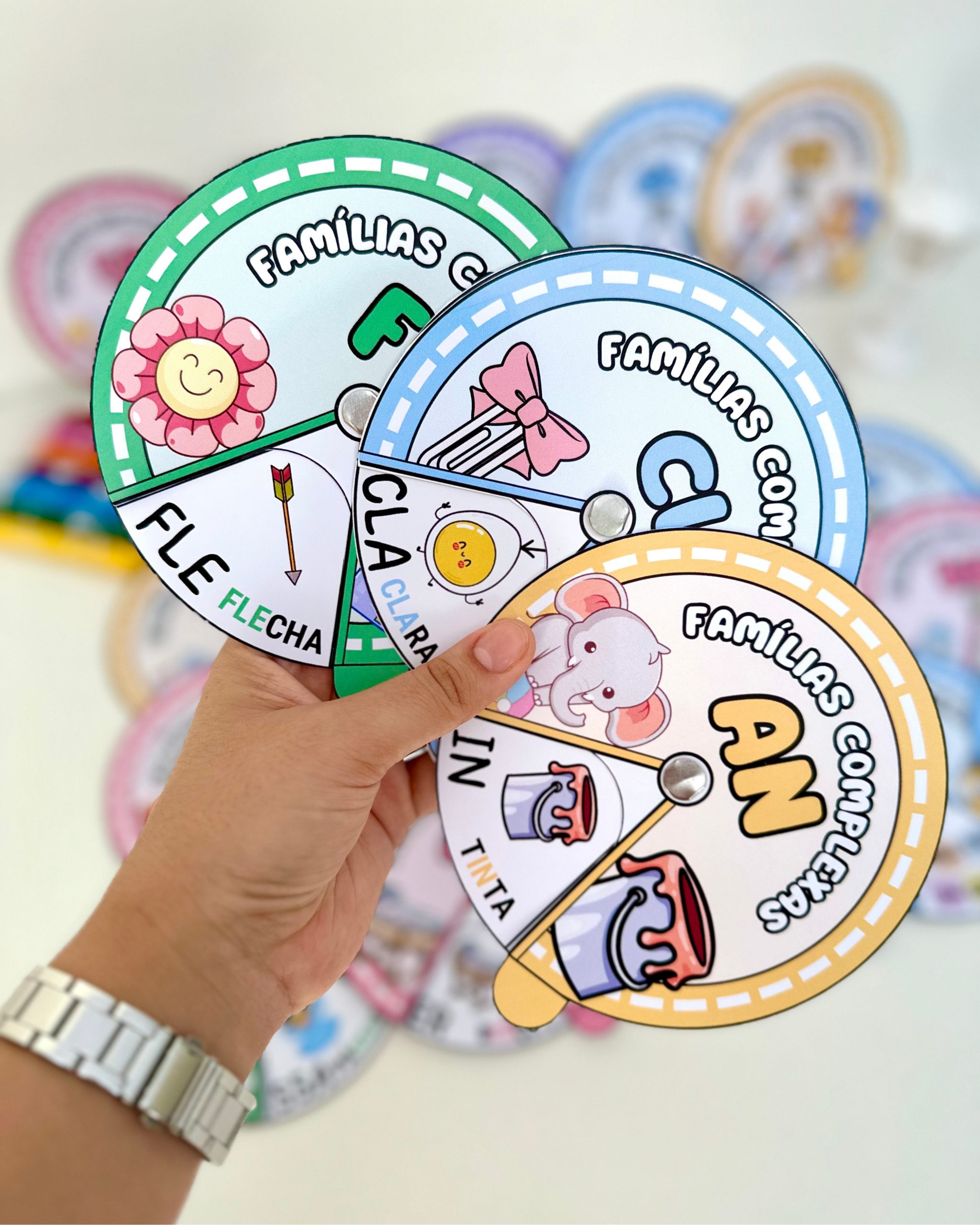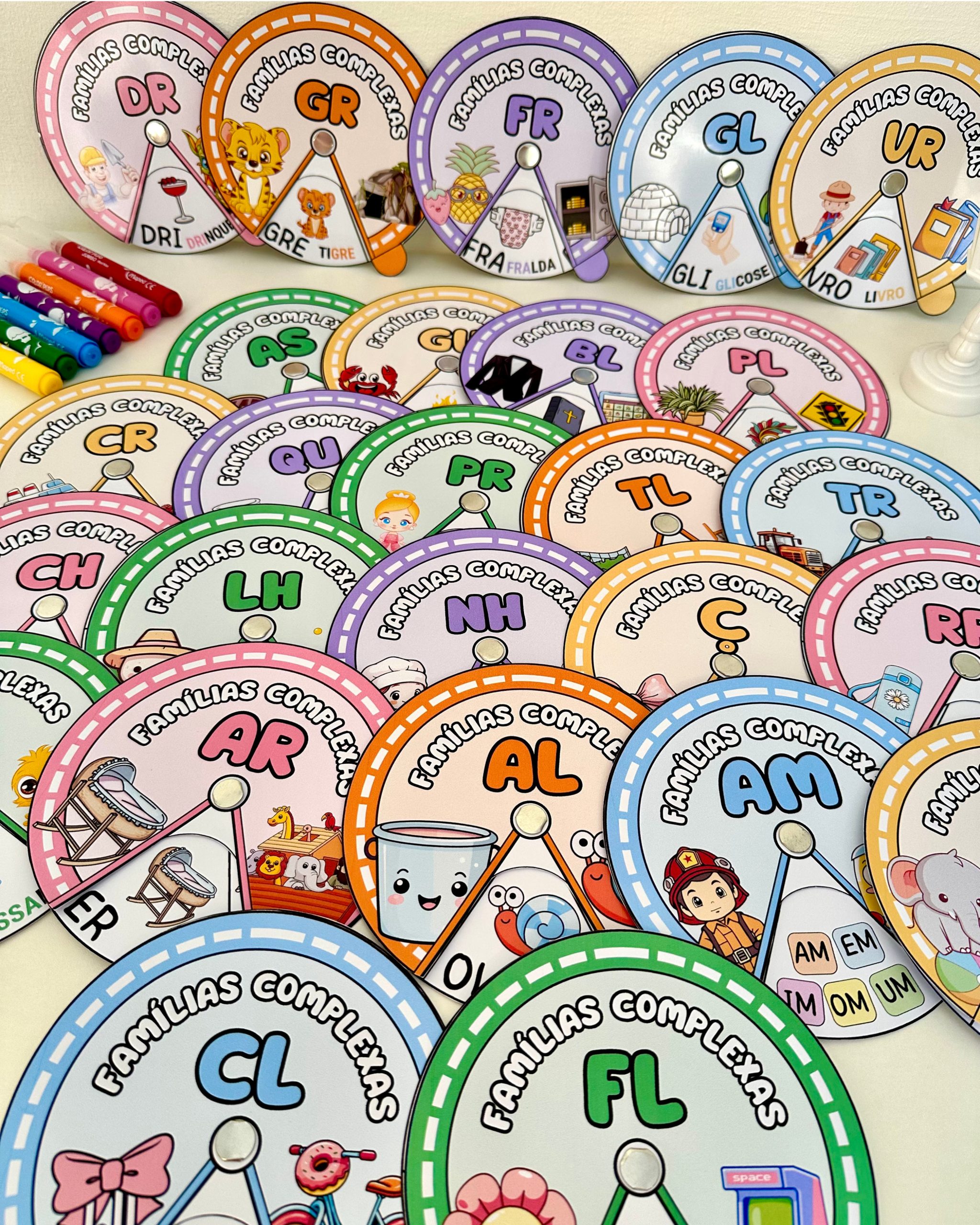 O arquivo vai com a roleta de todas as famílias silábicas complexas, com 1 roleta por página, em PDF pronto para